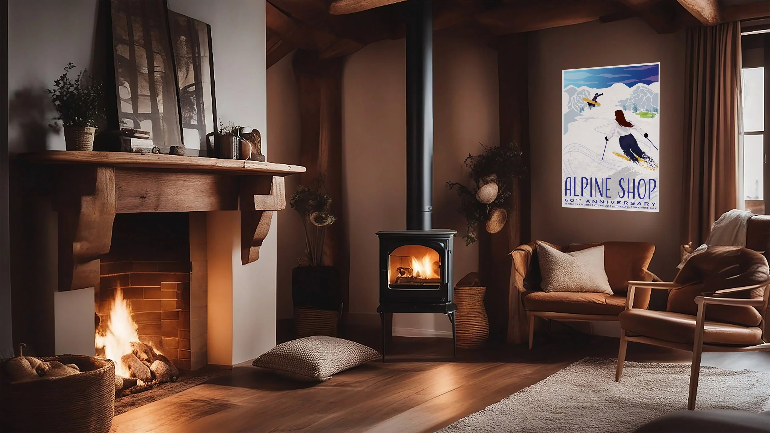 I designed the 60th Anniversary poster for Alpine Shop, a shop in Burlington that sells outdoor gear such as skis, golf, and outerwear. Combining my passion for skiing and art, I aimed to preserve the vintage alpine aesthetic while adding my own artistic style. The campaign reflects the brand's heritage while incorporating contemporary design techniques.